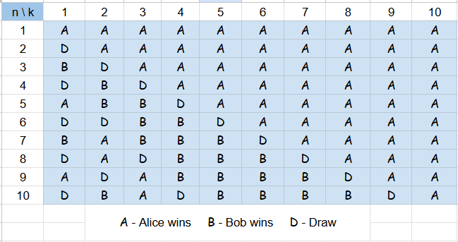 equals zero then its a Draw., then Bob wins.#include <bits/stdc++.h>